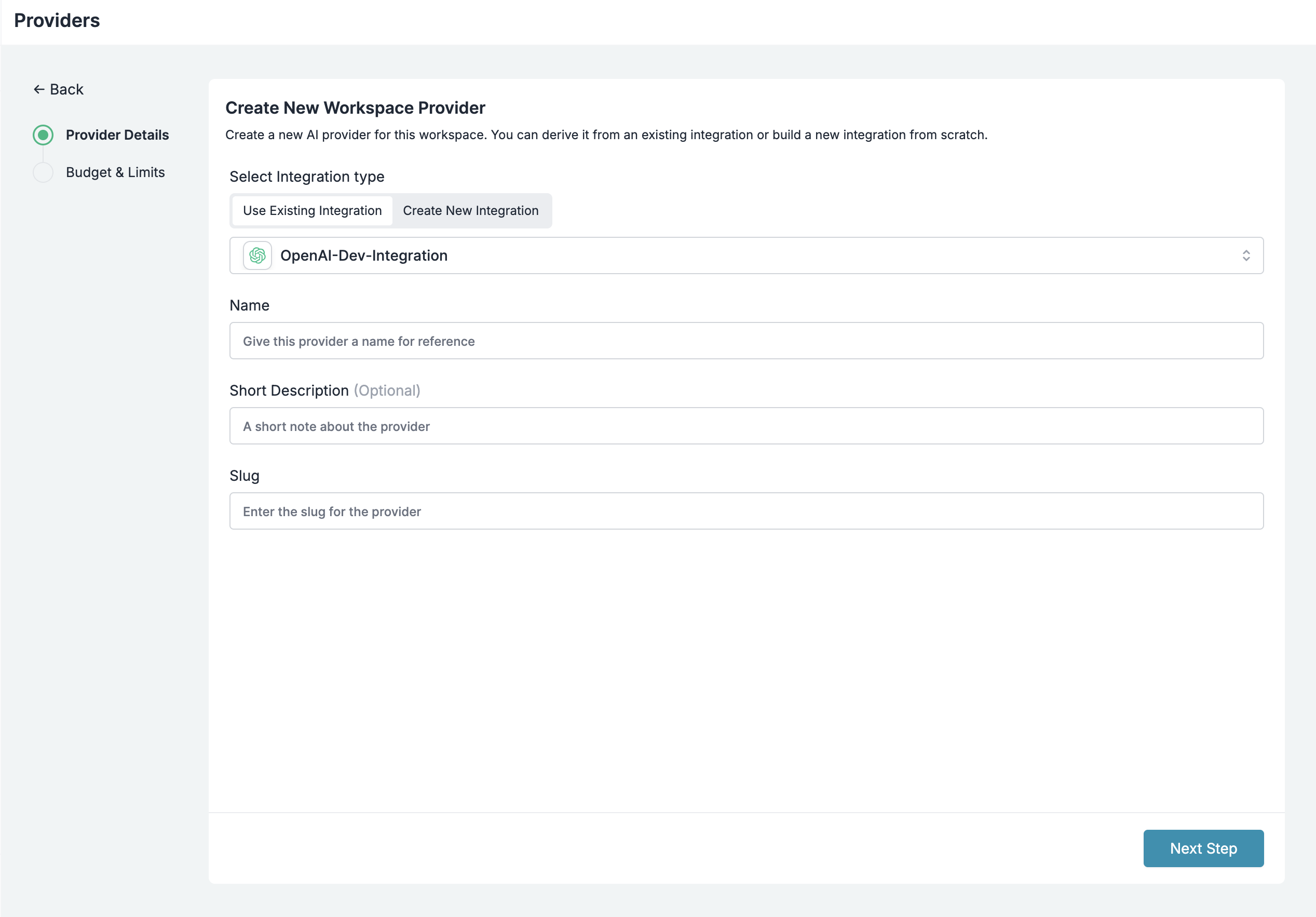 Select your provider (OpenAI, Anthropic, etc.), enter your API key, and create a slug like