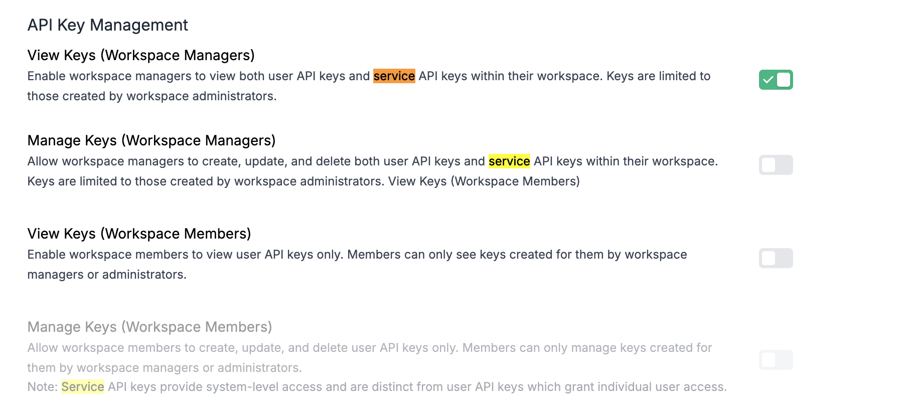 View Keys (Workspace Managers)Enable workspace managers to view both user API keys and service API keys within their workspace. Keys are limited to those created by workspace administrators.