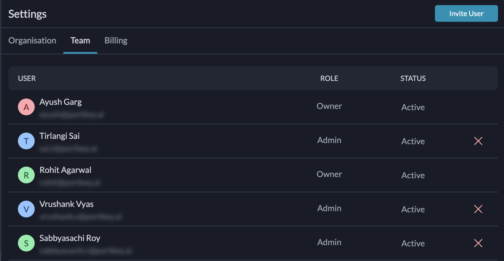 Ownershave complete control over the organization, including user management, billing, and all platform features.Adminshave elevated privileges, allowing them to manage users, prompts, configs, guardrails, integrations, providers, and API keys.Membershave access to essential features like logs, analytics, prompts, configs, and integrations, providers, with limited permissions.
