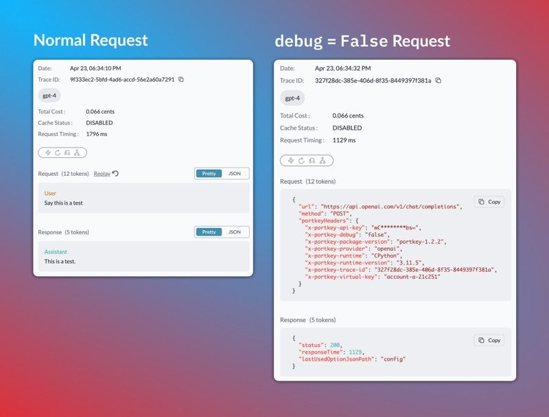 The DO NOT TRACK option allows you to process requests without logging the request and response data. When enabled, only high-level statistics like tokens used, cost, and latency will be recorded, while the actual request and response content will be omitted from the logs. This feature is particularly useful when dealing with sensitive data or complying with data privacy regulations. It ensures that you can still capture critical operational metrics without storing potentially sensitive information in your logs. To enable DO NOT TRACK for a specific request, set the debug flag to false when instantiating your Portkey or OpenAI client, or include the x-portkey-debug:false header with your request.