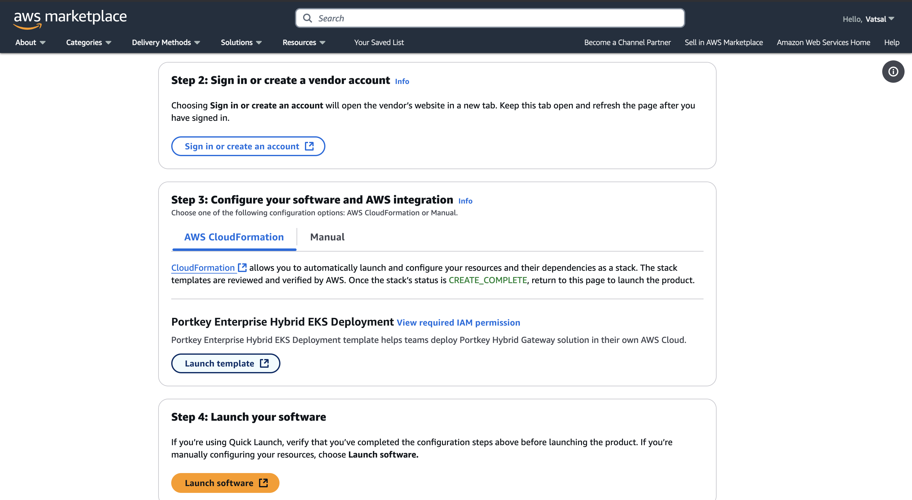 Upon subscribing to the Portkey AI Enterprise Edition, you will be able to select Quick Launch from within your AWS Console Subscriptions.